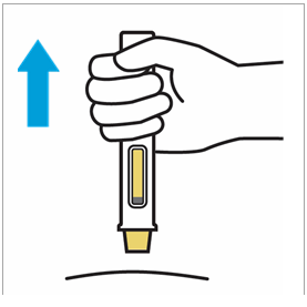 Aseta esitäytetty kynä kohtisuoraan pistoskohtaan. Paina sitten esitäytettyä kynää ja pidä se ihoa vasten painettuna.