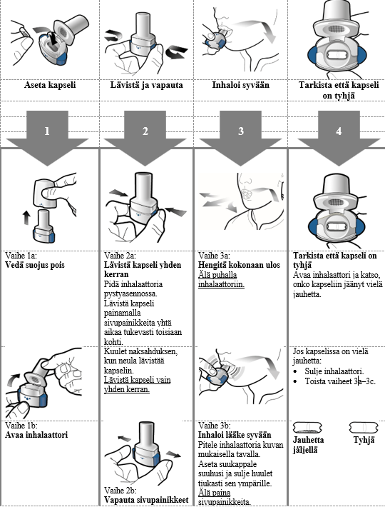 - Tutustu tämän pakkausselosteen lopussa oleviin ohjeisiin, joissa kerrotaan tarkemmin inhalaattorin käytöstä.