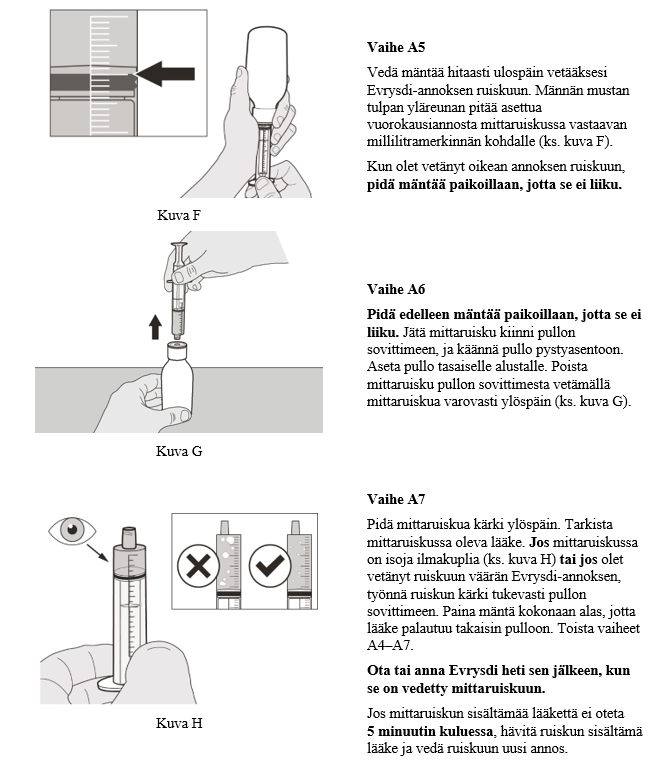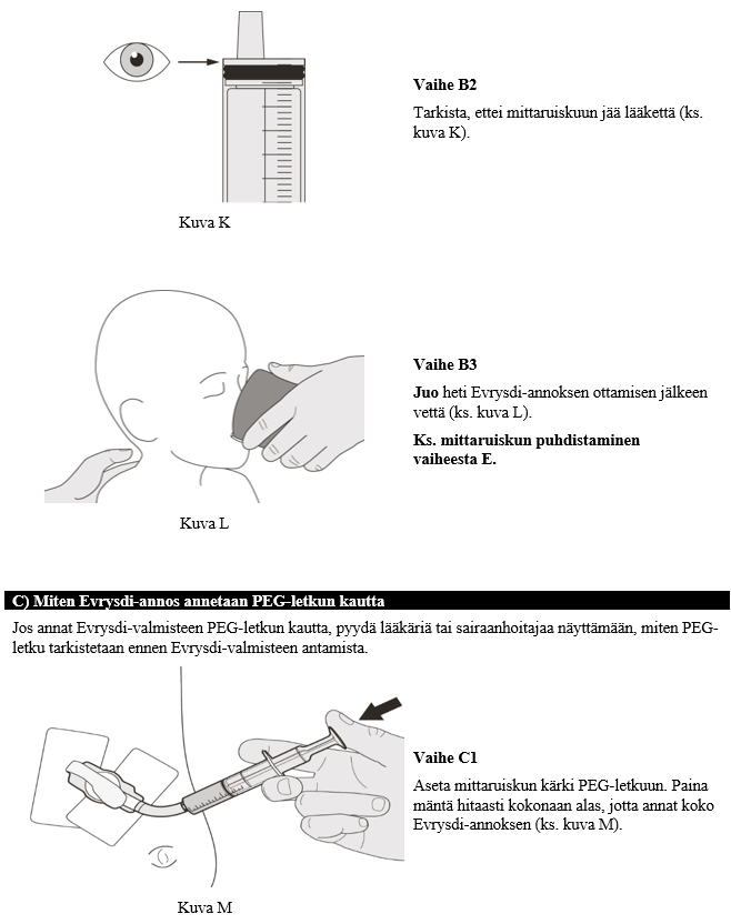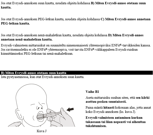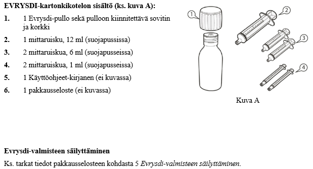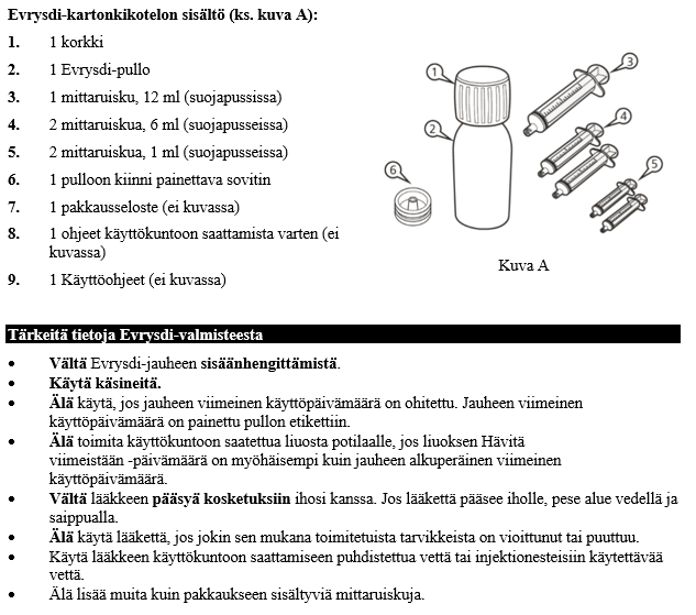 Lue myös huolellisesti Käyttöohjeet-osio siitä, miten Evrysdi-valmistetta otetaan tai miten sitä annetaan, ja noudata annettuja ohjeita.