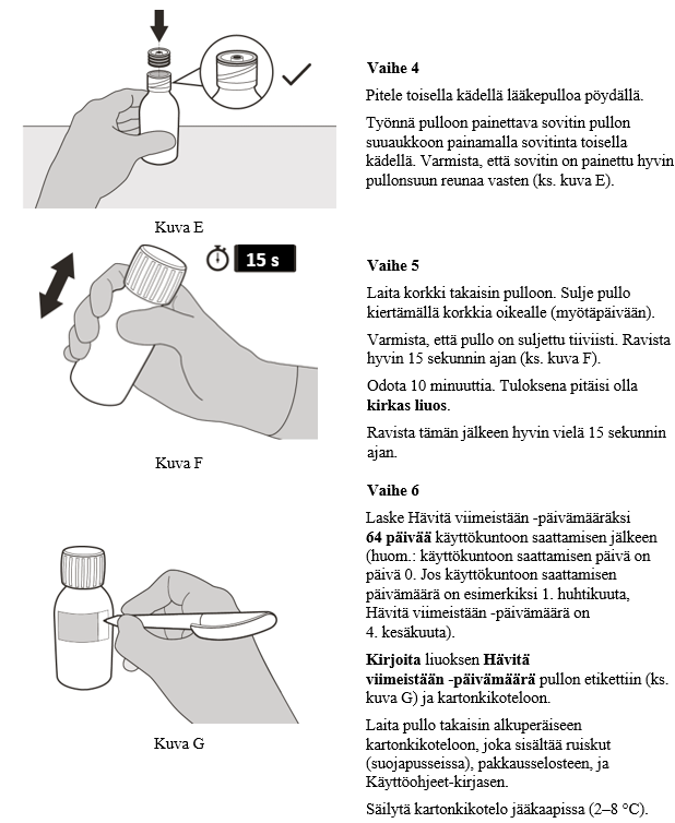- Apteekissa käyttökuntoon saatettu oraaliliuos säilyy jääkaapissa (2–8 °C) säilytettynä 64 päivää. Apteekkihenkilökunta merkitsee viimeisen käyttöpäivämäärän pullon etiketissä ja alkuperäisessä kartonkikotelossa olevan ”Hävitä viimeistään” -merkinnän jälkeen. Älä käytä liuosta ”Hävitä viimeistään” ‑päivämäärän jälkeen tai hävitä lääke, jos pulloa on säilytetty huoneenlämmössä (alle 40 °C) yhteenlaskettuna pidempään kuin 120 tunnin ajan (5 päivää).