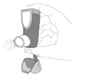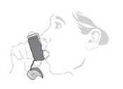 - Börja andas in långsamt och djupt genom munnen, och tryck omedelbart efter påbörjad inandning hårt på räkneverket (på ovansidan av inhalatorn) för att släppa ut en puff. Fortsätt att andas in så djupt du kan en stund efter att du tryckt på räkneverket, så att läkemedlet kommer djupt ner i lungorna. Denna inandningsmanöver ser till att läkemedlet når ned i dina lungor.