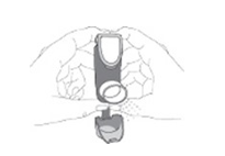 - Ta bort locket från munstycket genom att trycka lätt på upphöjningarna på sidan. Remmen till munstyckeslocket ska sitta kvar på inhalatorn.