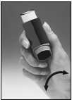 | 4. Håll inhalatorn upprätt, så att tummen är under munstycket. Andas ut så långt som det känns bekvämt. |