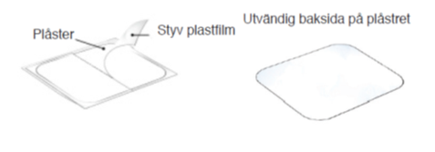 - Den klibbiga sidan på depotplåstret täcks av en tvådelad, styv plastfilm. Böj depotplåstret på mitten och ta bort ena halvan av den styva plastfilmen. Var försiktig så att inte depotplåstret klistras ihop och undvik att röra vid den klibbiga sidan på depotplåstret.