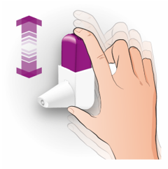 • Håll inhalatorn upprätt och skaka den 3 till 5 gånger.