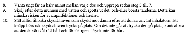 - irritation i halsen. Detta kan förebyggas genom att skölja munnen med vatten och spotta ut det omedelbart efter varje inhalationstillfälle.