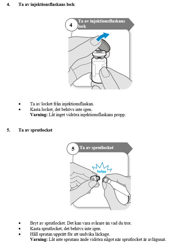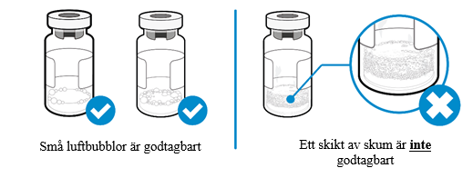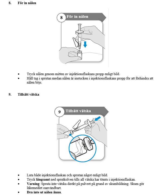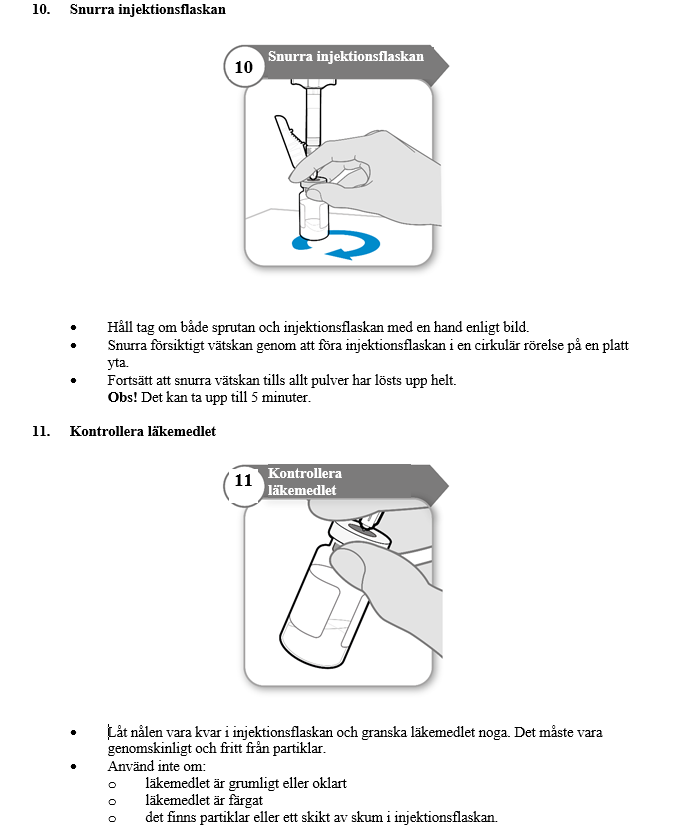 - Nej – skaka aldrig injektionsflaskan. Att skaka kan förstöra läkemedlet och bilda skum. Det kan ta några minuter för pulvret att lösas upp helt, så fortsätt att snurra injektionsflaskan försiktigt tills vätskan är helt genomskinlig.