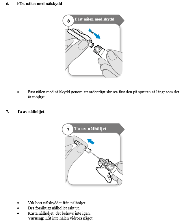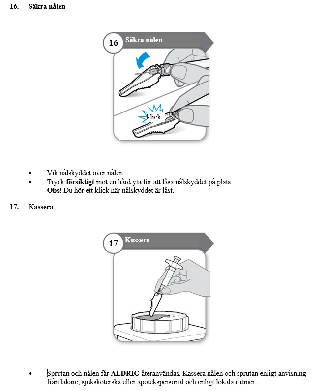 - Endast en gång. Avlägsnande och återinföring ökar risken för skada på nålen och gör nålen trubbig. Det kan orsaka obehag och öka risken för hudskada och infektion. Det finns även risk att du kan få för lite av läkemedlet.