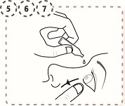 7. Kläm försiktigt på endosbehållaren så att två droppar kommer in i ögat och släpp sedan det undre ögonlocket.